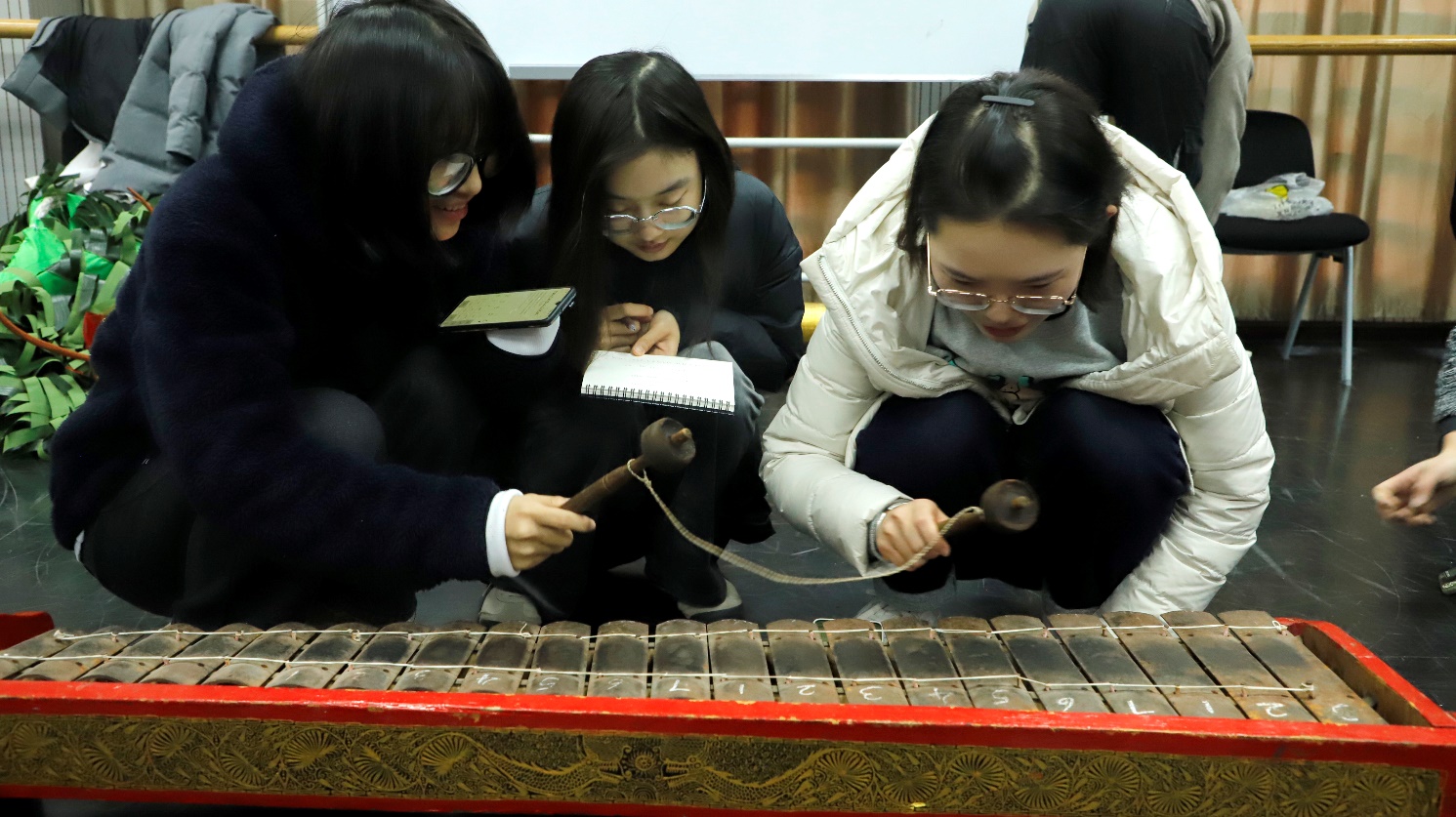 在学习歌曲的同时,负责器乐传承的民间艺人向国乐系的学生进行了傣族传统器乐的讲解与示范。由于艺人们都是口传心授进行教学,对于乐谱的记录与留存具有局限性,所以由学生现场记谱并进行演奏学习。在学习演奏傣族乐器云铓的过程中不难发现,该乐器由两个八度的音构成,演奏时多采用八度交替的形式,在这一特性中,蹦duang(钢片琴)的演奏方式与其类似。