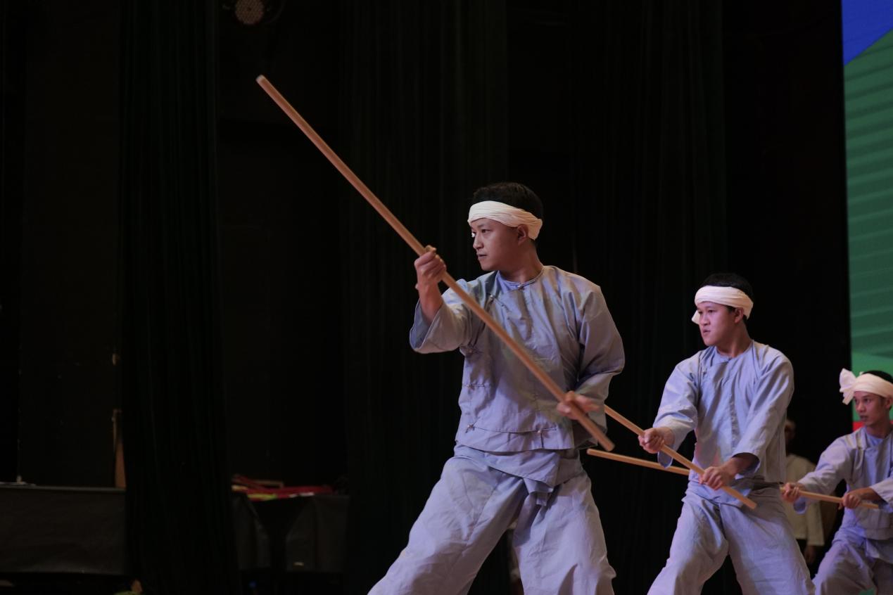 本次活动共两项流程,第一项由西双版纳傣族自治州傣族民间歌舞乐表演队、我校新葡萄8883官网AMG和舞蹈学院学生共同演出。开场由国家级傣族象脚鼓传承人波罕丙、州级傣族象脚鼓传承人岩坎逢、象脚鼓民间艺人岩公坎等人共同带来传统象脚鼓舞表演。第二个节目“赞哈”由国家一级演员玉旺囡、国家二级演员岩建出演。当现场观众仍在回味赞哈独特的音乐时,第三个西双版纳傣语字母歌拉开帷幕,由岩建、玉旺囡、新葡萄8883官网AMG学生等人共同演出,表演人员与台下观众热情互动,全场气氛高涨。最后由波罕丙、岩坎逢、岩公坎等人与舞蹈学院学生共同带来西双版纳傣族象脚鼓舞。节目中表演老师详细介绍象脚鼓舞、赞哈等傣族特色民间歌舞乐,观众受益颇多。