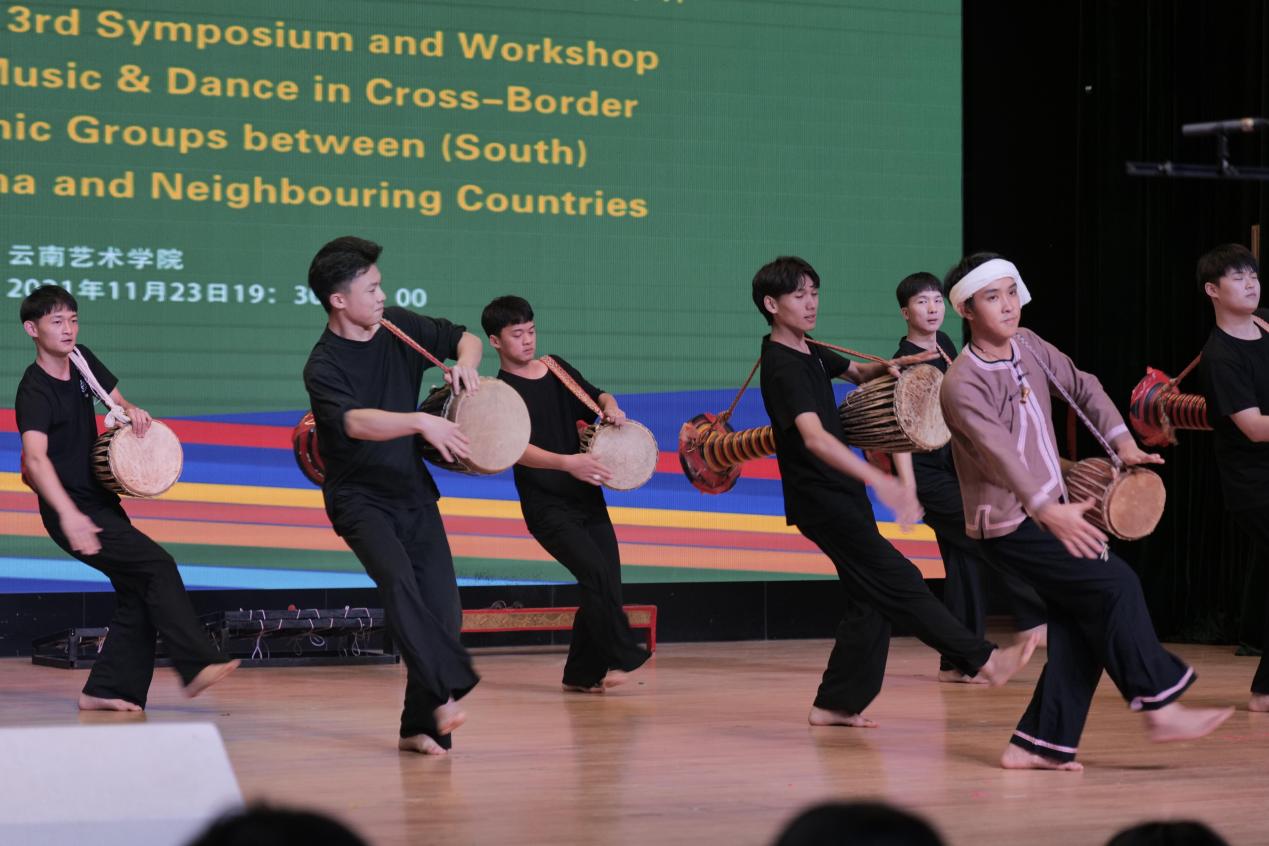 第二项活动由临沧地区耿马县文化馆/民族文化工作队(文艺演出团队)与我校新葡萄8883官网AMG、舞蹈学院学生共同表演,由王峰主持。首先是傣族古乐舞,由演出团队成员安芒、俸玉款、李学琴、普丽花等人进行乐舞表演,由能底、岩细、俸文杰进行器乐伴奏。第二个节目耿马傣族鼓语由李波、岩依、岩平、依帐等人共同表演,主持人王峰简要介绍耿马傣族及其使用的三种傣文、乐器,以及耿马音乐舞蹈,充分展示当地傣族文化的丰富多彩。演出活动中,耿马傣族同胞向现场观众介绍神兽之舞,并教授象脚鼓鼓语,全场观众热情回应,争先恐后回答问题,全场气氛热烈,满堂欢声笑语。紧接着,由俸小美、叶弄、尹夜、砍润、刀永新等团队成员先后带来蝴蝶舞、紧那罗、傣族传统武术,现场掌声雷鸣。最后,由李志明、相农、引少等成员为观众带来原创舞蹈节目“舞刀少年”“南西米”“马鹿舞”。表演嘉宾与云艺学子们共同呈现了一场精彩纷呈的演出,现场高潮迭起,掌声经久不息。教学展演在快乐与期许中落下帷幕,民族音乐文化所带来的震撼深深烙印在每位观看演出的人心中。