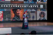 第四部分由墨江县文化馆的胡斌洁老师主导,身着哈尼族传统服饰的新葡萄8883官网AMG学生们与传承人老师纷纷上台,在极富韵律的歌调中哈尼族传统采棉、纺线、织布、制作服饰的过程一一呈现。丰富多彩的慧影霓裳,犹如哈尼人的根,在纵横交错的经纬里,不仅蕴藏着家乡的山,故乡的水,也承载着哈尼人朴素的宇宙观和别样的“美”。