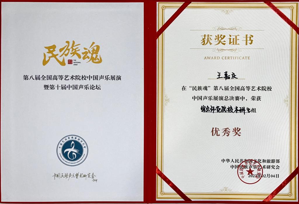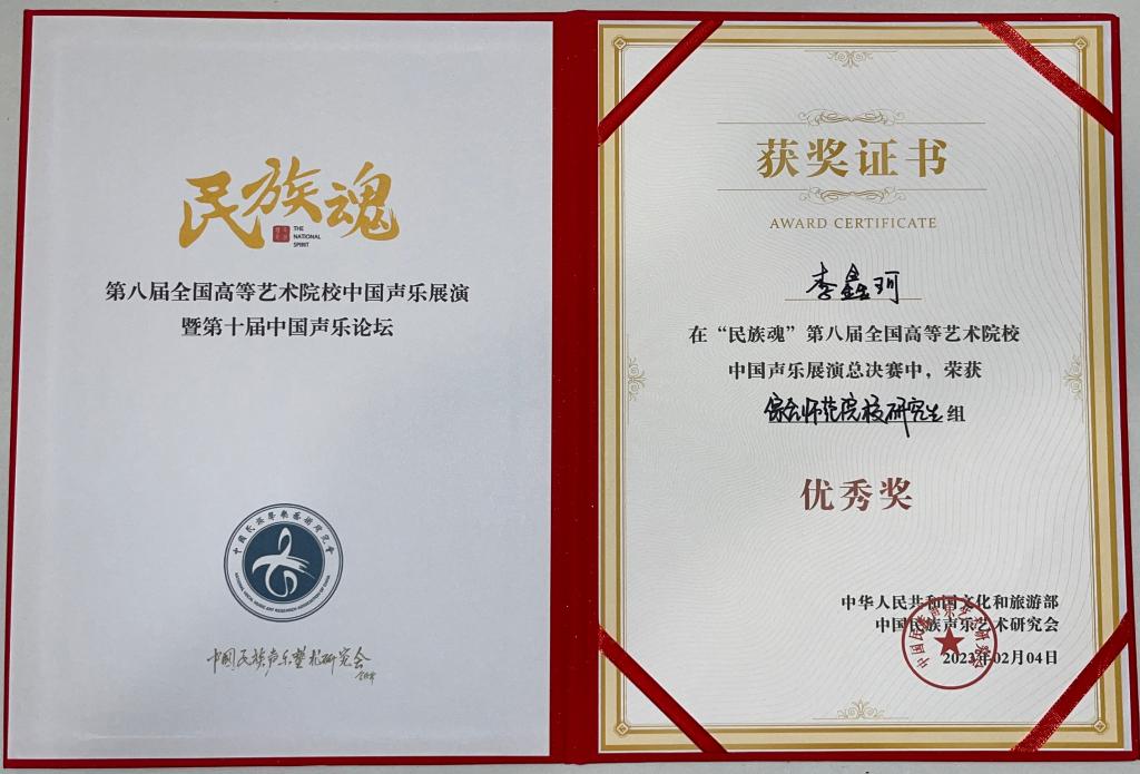 2023年2月,新葡萄8883官网AMG师生在“民族魂·第八届全国高等艺术院校中国声乐展演”中喜获佳绩,研究生姚弦歌荣获综合师范院校研究生组金奖,指导教师林林教授获优秀指导教师奖。此外,新葡萄8883官网AMG在本次展演中斩获佳绩的学生还有王嘉庆荣获综合师范院校本科生组优秀奖,指导教师为陈红玲教授;李鑫珂获综合师范院校研究生组优秀奖,指导教师为舒丽萍副教授。