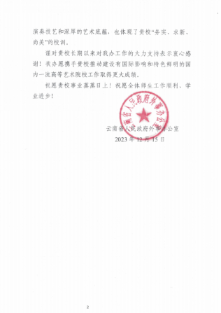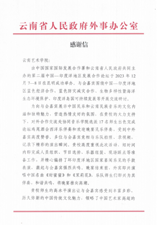 云南省人民政府外事办公室致云南艺术学院感谢信