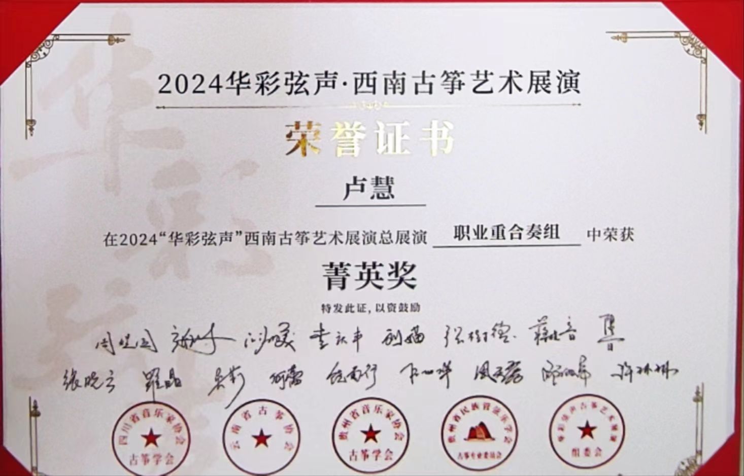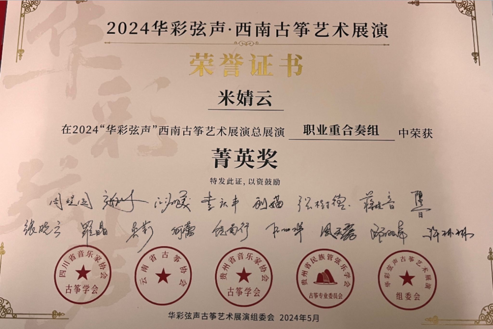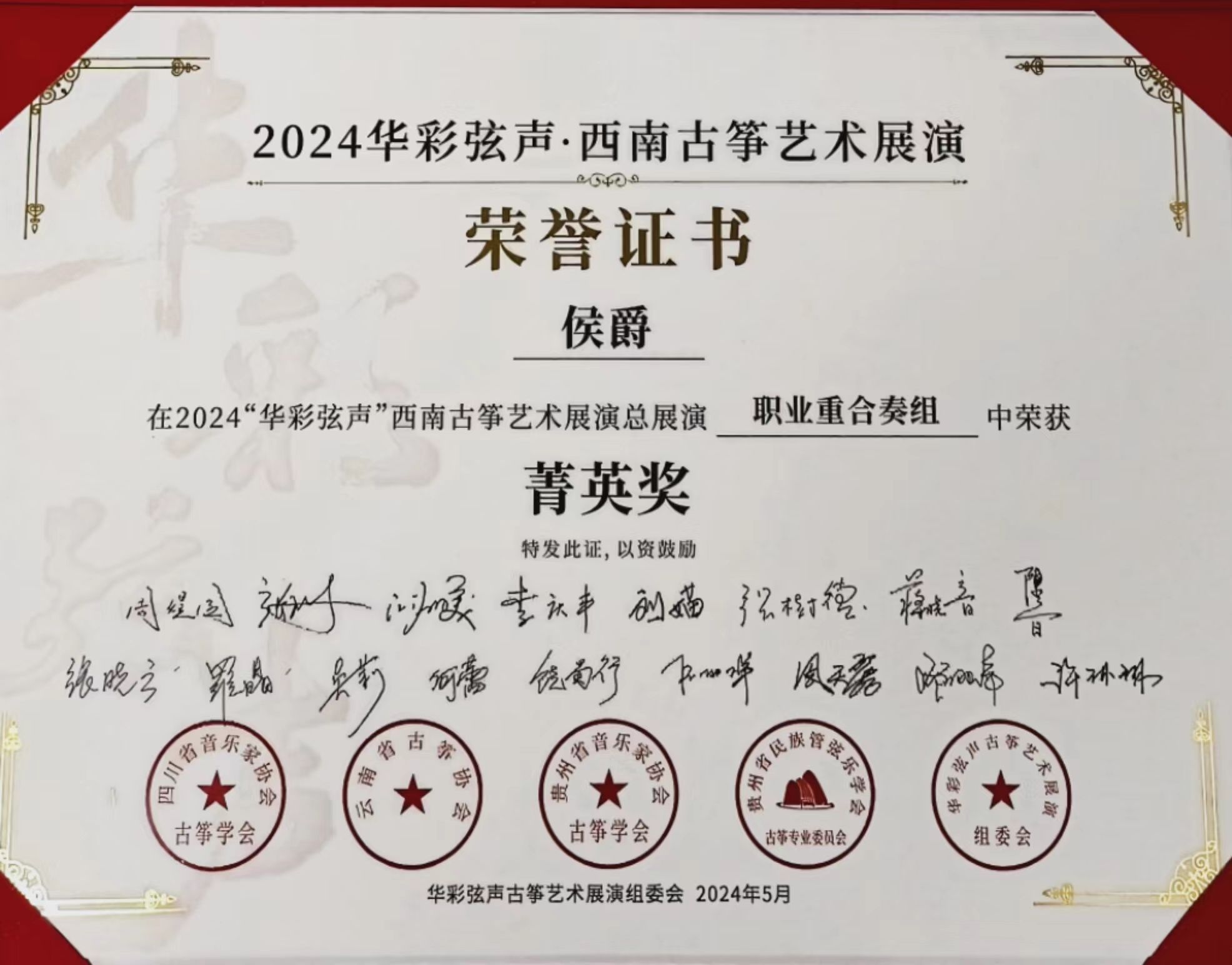 2024年5月1日至5日,由四川省音乐家协会指导,四川省音乐家协会古筝学会、云南省古筝协会、贵州民族管弦乐学会古筝专业委员会、贵州省音乐家协会古筝学会主办的“华彩弦声”第一届西南云贵川渝古筝艺术展演在四川新葡萄8883官网AMG举行。新葡萄8883官网AMG国乐系教师林恬、陈珂井指导的2023级学生侯爵、卢慧、米婧云荣获职业重合奏组菁英奖。