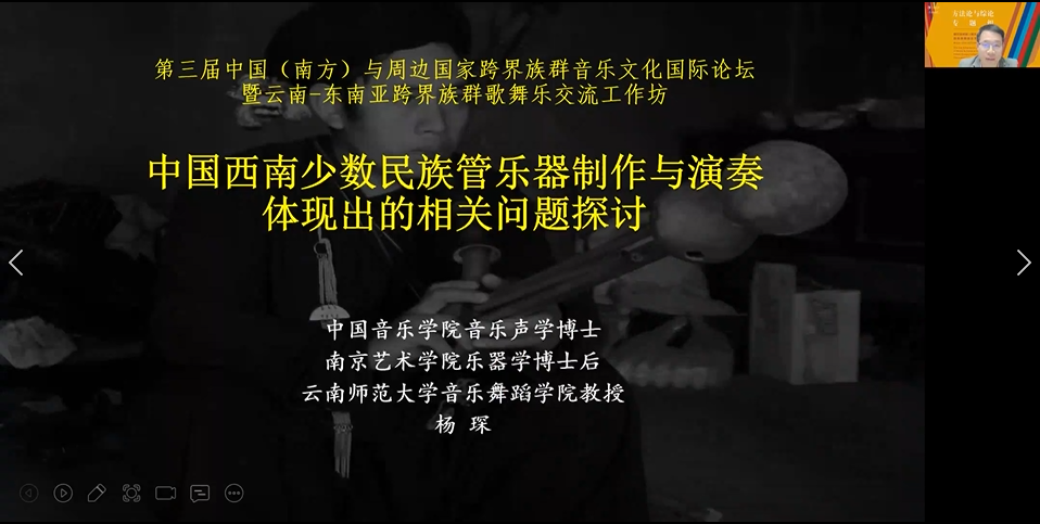 云南师范大学杨琛教授《中国西南少数民族管乐器制作与演奏体现出的相关问题探讨》一题中针对西南少数民族管乐器命名、乐器开孔、乐器音色的认知以及乐器演奏技术等问题展开探讨,南京艺术学院的杨曦帆教授在《嘉绒藏族音乐文化志的跨学科研究方法探索》一题中从宗教、神话、传说、民俗、历史事件等角度观察嘉绒藏族音乐形成的流动性,介绍两种观点:一是音乐民族志描述不仅要有静态的一面,还要把握研究对象在生成过程中所发生的诸种关系的动态过程描述的能力;二是跨界族群音乐文化研究中的跨文化既是局内的,同时也是局外的,相似性和差异性在跨界研究中都应该是常态;广西艺术学院陈坤鹏教授在其《一弦类乐器的策动方式及其关系论》一文中,介绍了一弦类乐器的振动、用弦、审美等,总结出一弦类乐器其策动方式有擦奏、拨奏、击奏、击奏与拨奏结合等四种形式,就“一弦类乐器旋律特点”“二弦同度的一弦审美”等问题提出相关观点。
