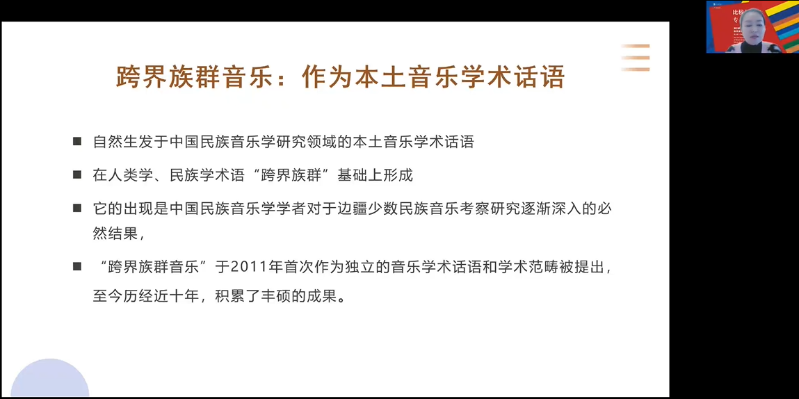 西安新葡萄8883官网AMG宁颖在《中国“跨界族群音乐”研究的历程与困境》发言中谈到跨界族群音乐于2011年首次提出,历经近十年的发展,积累了丰硕成果。从上世纪七十年代末到2011年,是跨界族群音乐研究的孵化期,从2011年至2021年进入跨界族群音乐研究的黄金时代,研究主要涉及三个区域和四个学术团队,对跨界族群音乐研究中的时空观进行思考,从基音、文化、环境的关联性看跨界族群音乐研究,并对跨界族群音乐的影像叙事。宁颖提出跨界族群音乐研究存在的问题与困境有:跨界研究过程中历时视角与历史观的重要性、重新审视族群文化身份的必要性、语言能力与音乐民族志书写(主要是如何书写音乐的异同)、田野中的身体实践与身体壁垒以及应对疫情与国际政局的策略五个方面。