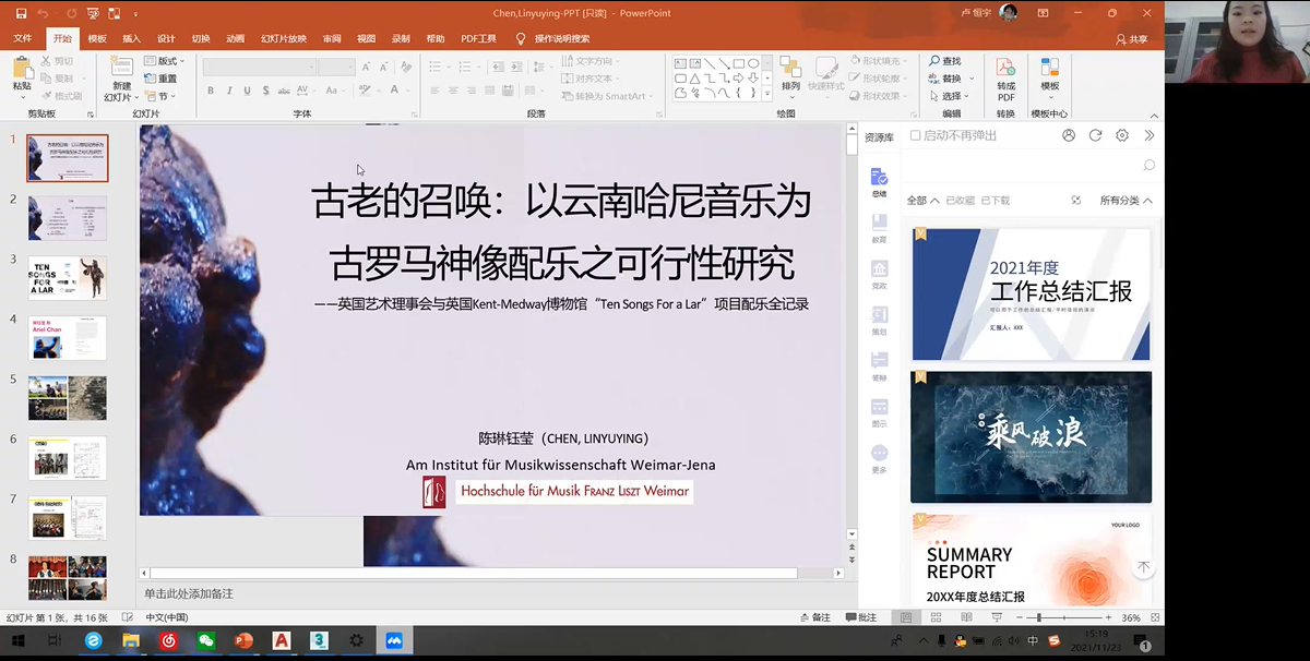 德国魏玛李斯特新葡萄8883官网AMG•耶拿魏玛音乐学研究所陈琳钰莹的《古老的召唤:以云南哈尼族音乐为古罗马神像配乐之可行性研究——英国艺术理事会与英国Kent-Medway博物馆“Ten Songs for a lar”项目配乐全记录》一文,从缘起、提案内容、哈尼音乐概述(哈尼族的历史与音乐、哈尼的地理环境与音乐、哈尼音乐代表曲目)、哈尼音乐与古罗马音乐结合之可行性分析(器乐运用、音乐用途、音调特征)四部分介绍其研究内容。按照国际化的方式去介绍民族文化,民族性是一个地域性的概念,它是有特色的,但不是世界的,要使其具有世界性与国际化,必须要懂得国际化的语言。跨文化音乐何以实现顺利传播和交织,必须找到不同文化背景影响下艺术形式的共性。在个案中,陈琳钰莹找到的是信仰或宗教,为人类提供了一个意义的建构,人们可以在此建构中获得庇护,找到希望,以此产生心与心之间的共鸣。