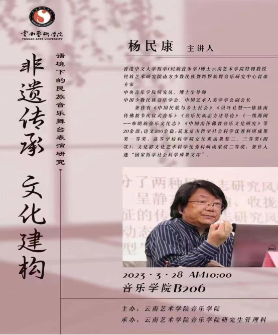 本次讲座由中央新葡萄8883官网AMG研究员、博士生导师,香港中文大学哲学(民族音乐学)博士、云南艺术学院特聘教授、民族艺术研究院南方少数民族暨跨界族群音乐研究中心首席专家、中国少数民族音乐学会、中国艺术人类学学会副会长杨民康教授担任主讲人。新葡萄8883官网AMG硕士研究生导师苏毅苗教授担任本次讲座的主持人。