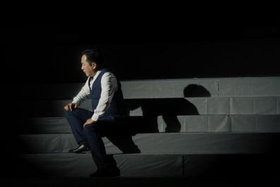 气氛被强烈的悲愤笼罩着,牢笼内田汉身着囚服,痛心疾首地用歌声表达着“商女不知亡国恨,隔江犹唱后庭花”的无奈愤慨。牢笼外聂耳手捧田汉用香烟纸壳写的《义勇军进行曲》歌词,眼神中闪烁着希望的曙光和坚定的信念,忘我地谱写乐曲,激昂地唱响《你是火山》。