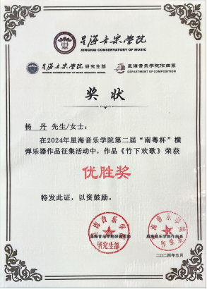 2024年5月,我院2021级作曲班学生杨丹所创作的古筝曲《竹下欢歌》参加由星海新葡萄8883官网AMG作曲系、研究生部、艺术实践与社会服务中心、教务部联合主办,声像与智能音乐实验室承办的2024第二届“南粤杯”横弹乐器作品征集活动中荣获“优胜奖”,指导教师:李娟。